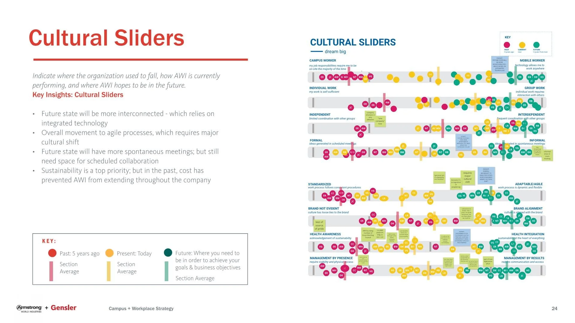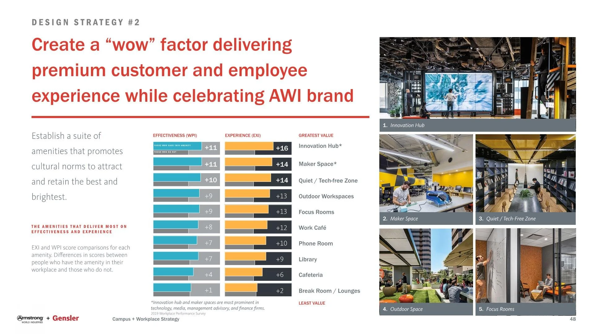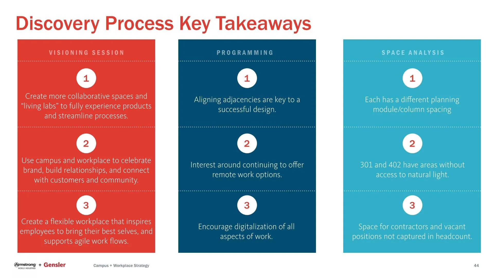 The Gensler team gathered and analyzed multiple data points (engagement survey, vision session, focus groups, trend research, benchmark comparison) to understand AWI culture, business practices, and core values. The following discovery activities provided a strong foundation upon which to build recommendations for the headquarters workplace strategy and program recommendations