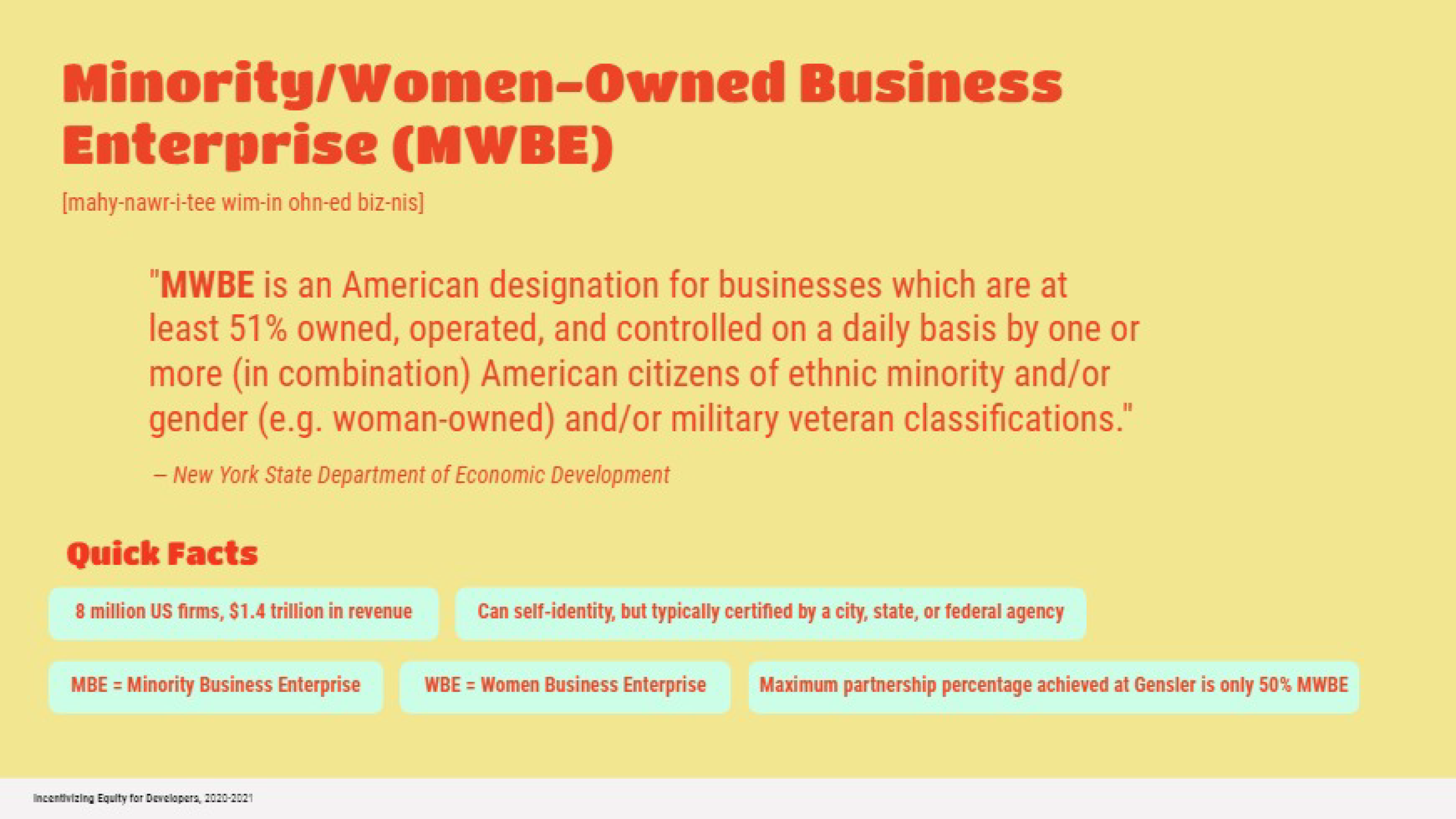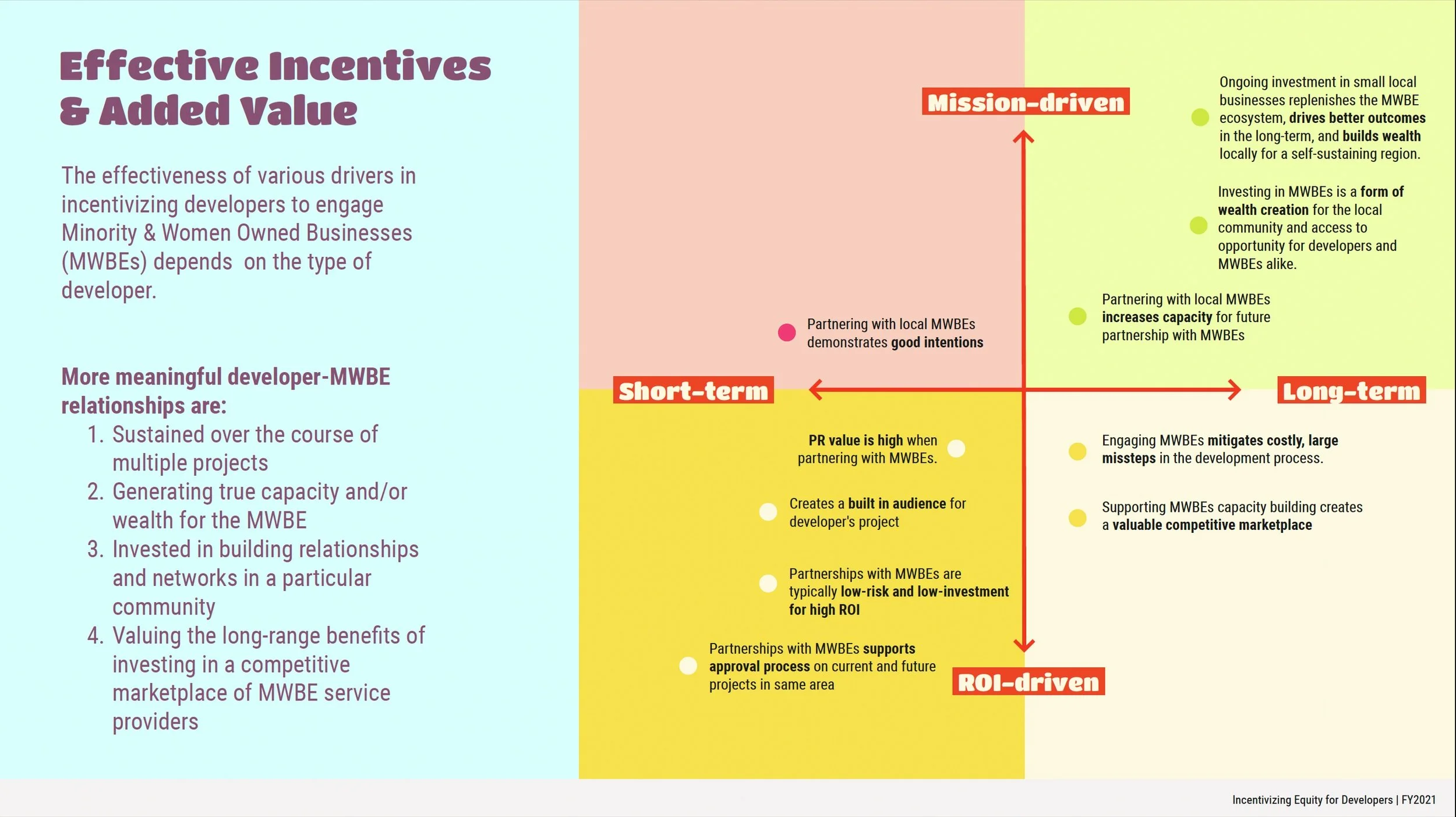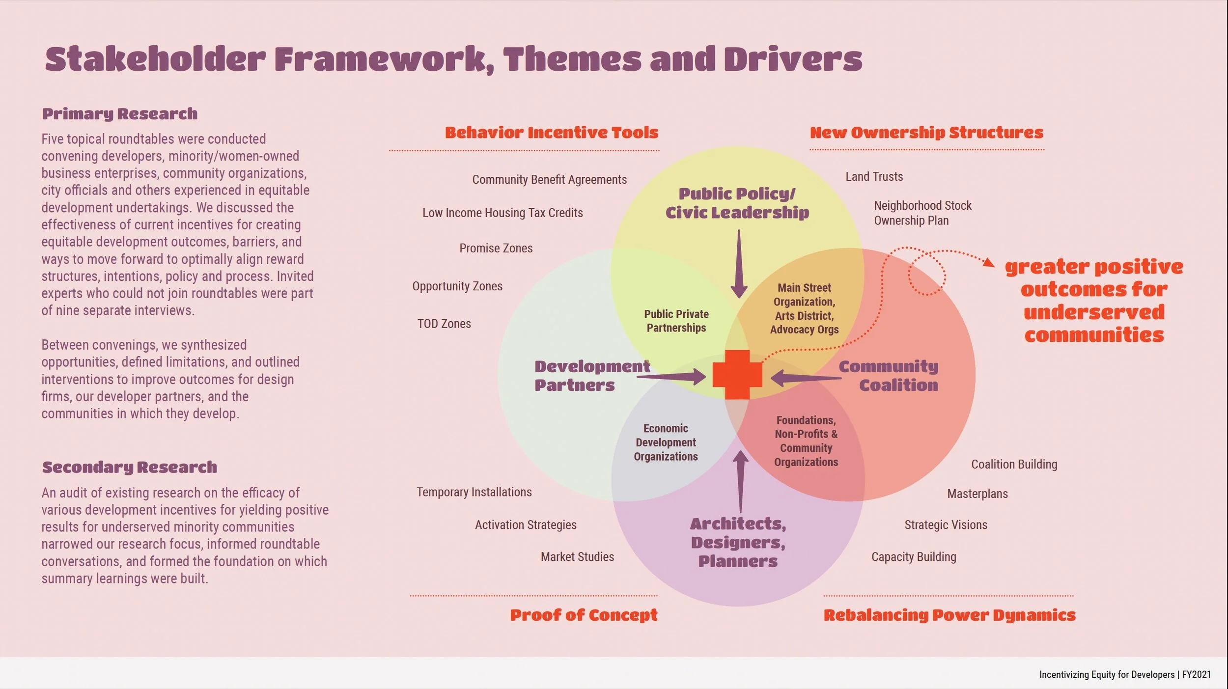 To give structure to this research phase, we utilized the human-centered design framework. To build empathy with our users and stakeholders, the team conducted a series of roundtables, individual interviews, industry survey and a literature review. The group sessions convened developers, minority/women- owned business enterprises, community organizations, city officials and others experienced in equitable development undertakings. We discussed the effectiveness of current incentives for creating equitable development outcomes, barriers they all face, and brainstormed how to optimally align reward structures, intentions, policy and process to keep the effort moving forward.