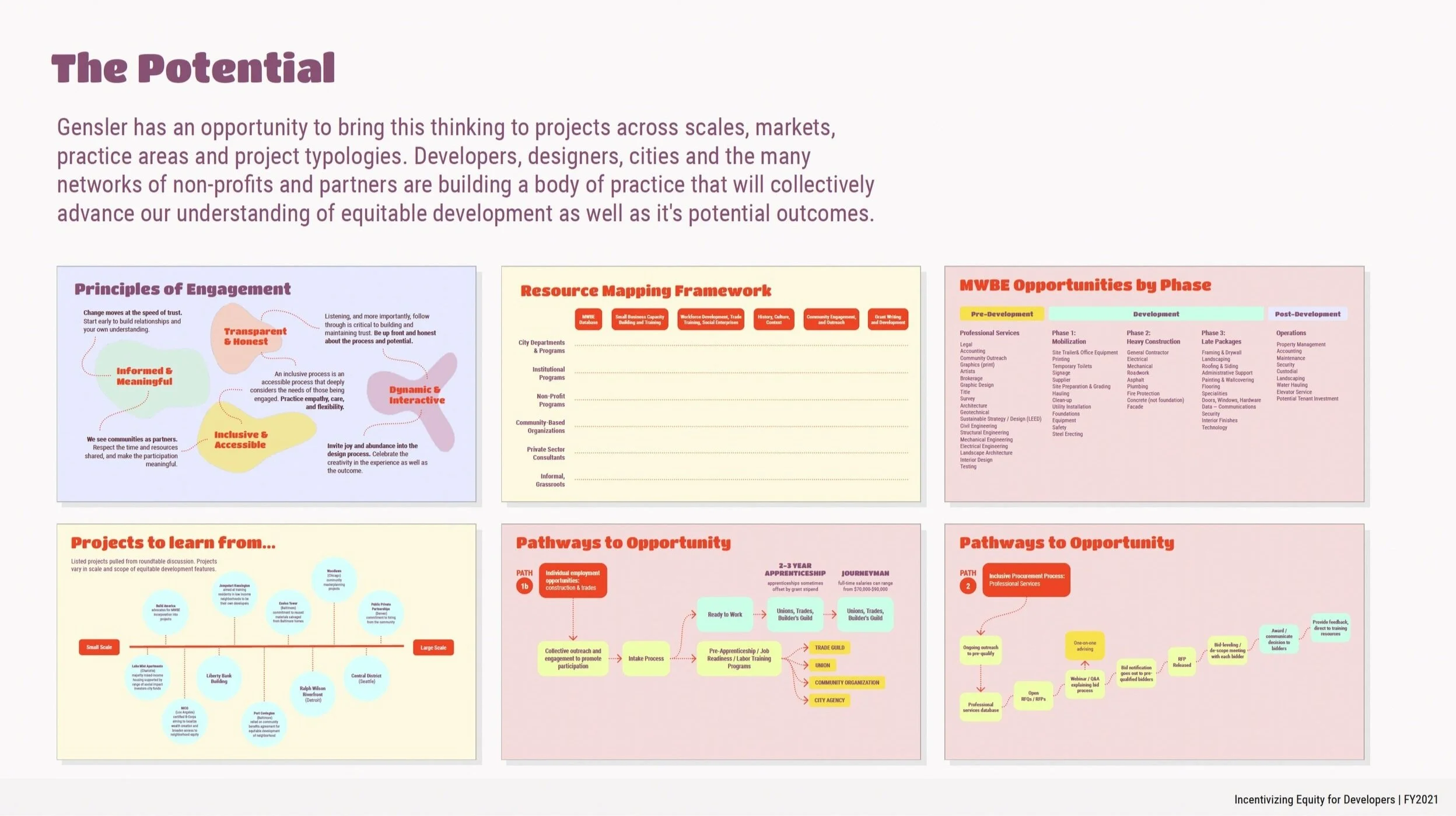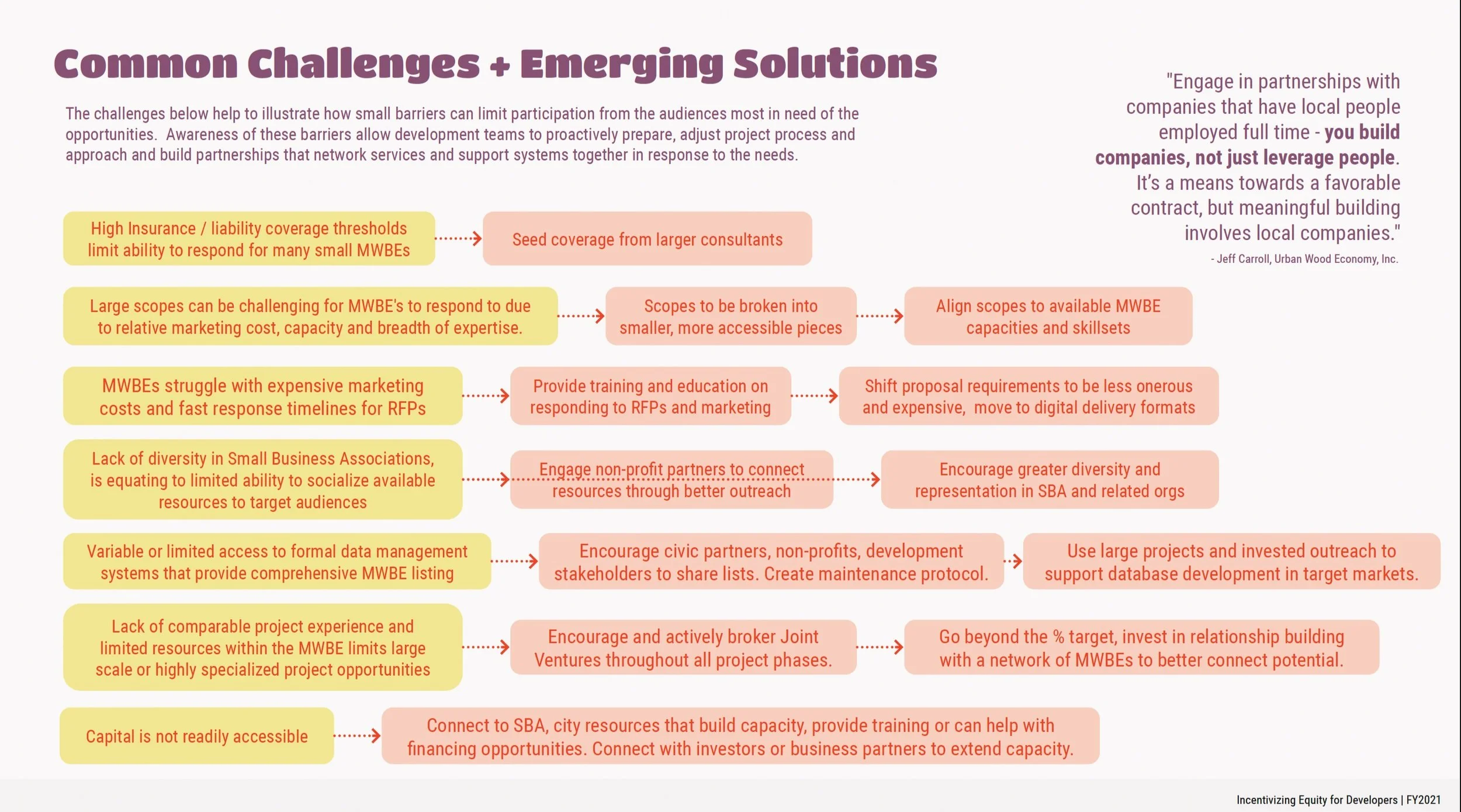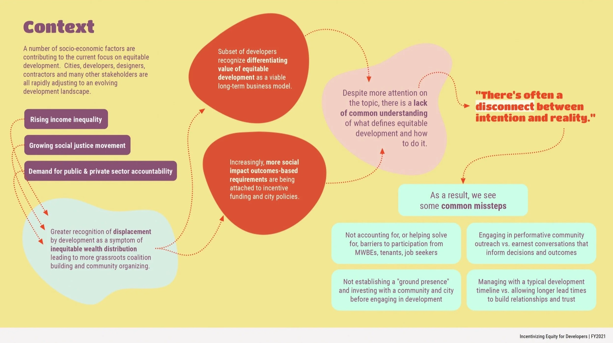 A number of socio-economic factors are contributing to the current focus on equitable development. Cities, developers, designers, contractors and many other stakeholders are all rapidly adjusting to an evolving development landscape. Despite more attention on the topic, there is a lack of common understanding of what defines equitable development and how to do it. The team identified these common challenges, and proposed (then prioritized) potential solutions for each area explored.