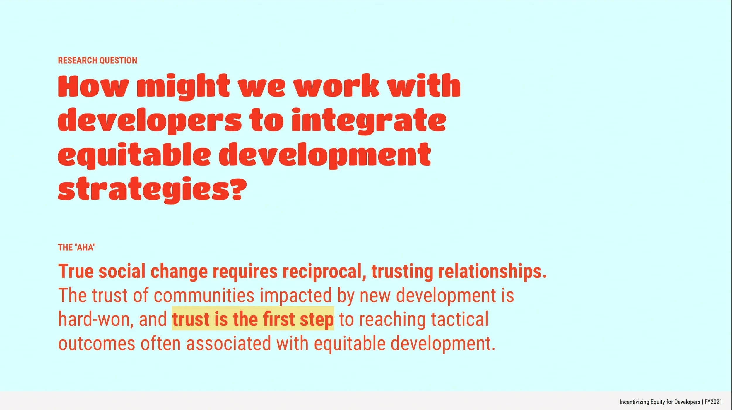 true social change requires reciprocal, trusting relationships. The trust of communities impacted by new development is hard-won, and trust is the first step to reaching tactical outcomes often associated with equitable development. Therefore, we began to build out a toolkits of resources to support developers and designers on their mission to enable equitable development.